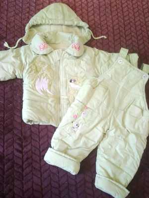 Костюм раздельный, бледно-салатового цвета. Комбинезон на пуговицах. Курточка на молнии. Состояние хорошее.