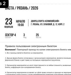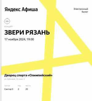 Продам 2 билета на концерт группы "Звери", цена на сайте 10400р. Билеты в 3-й сектор, 2-й ряд.