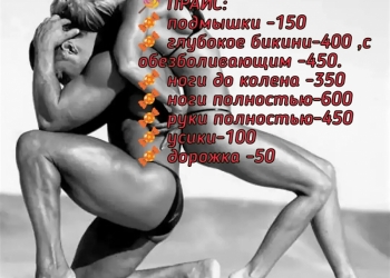 Воск: Подмышечные впадины 150 Бикини классика 200 Бикини глубокое 350 Сахар: Голени (с коленом) 350 Ноги полностью...